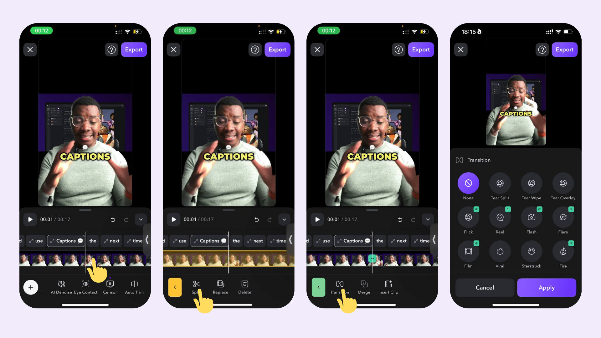 באמצעות AI, Captions תזהה אוטומטית שינוי בצילום ותוסיף סמן ויזואלי. זוהי דרך שימושית להמחיש את הפרויקט שלך ולהוסיף מעברים בקלות.
