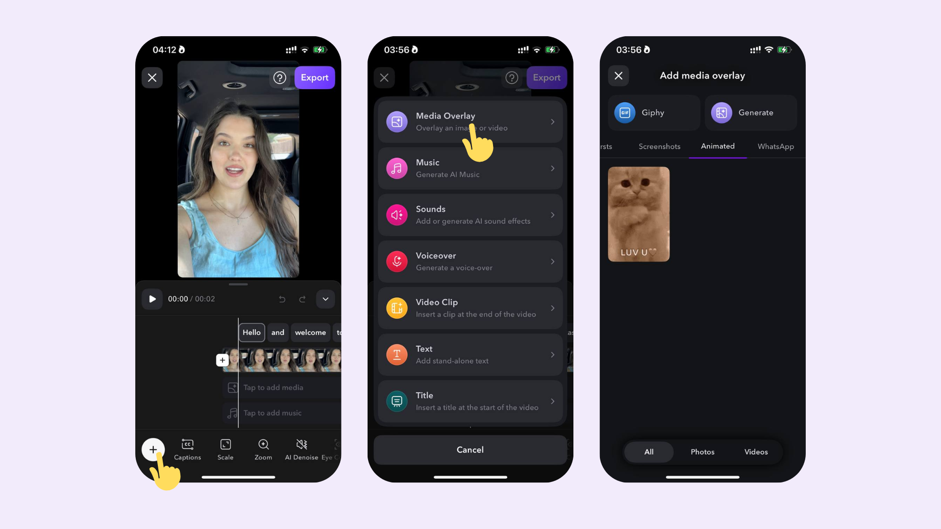 כדי להוסיף תמונות, סרטונים, GIFs, בחר Media Overlay. אז:- יבא תמונה או סרטון מהמכשיר שלך