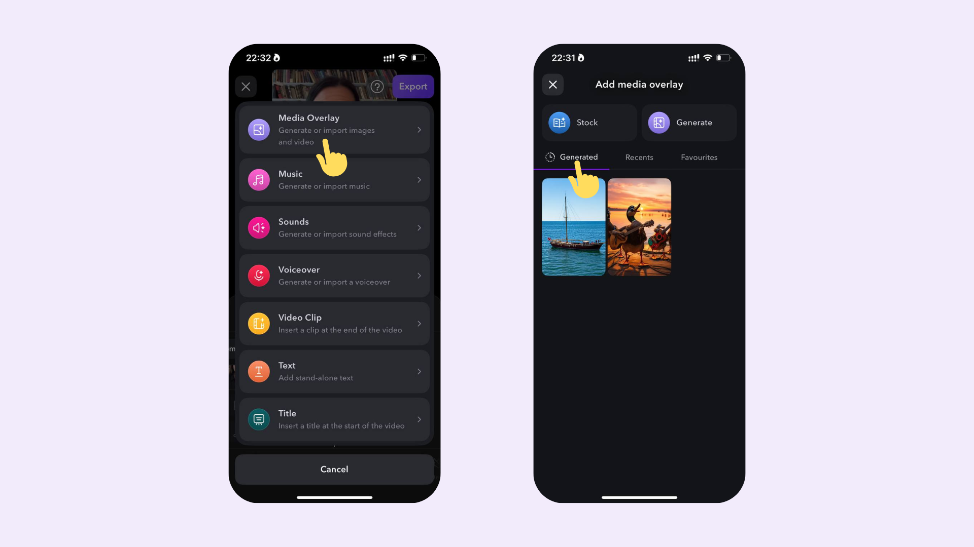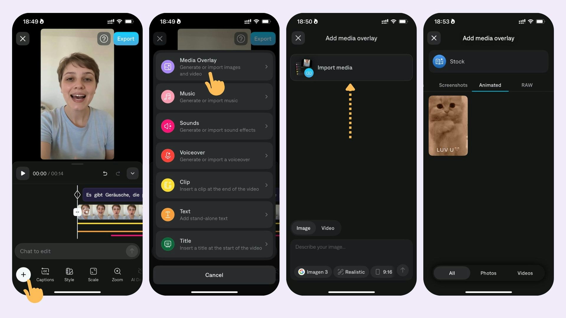- Animate (only for images): Tap Animate to animate and convert an image overlay into a video