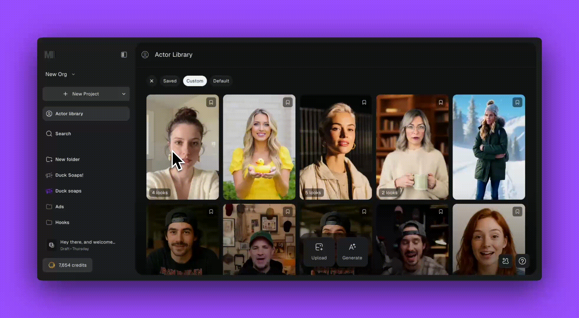 Each time you generate a new look, 4 results are presented. Choose the one you like to add it to the actor’s Looks panel. You can repeat to explore more variations.Prompting guide
